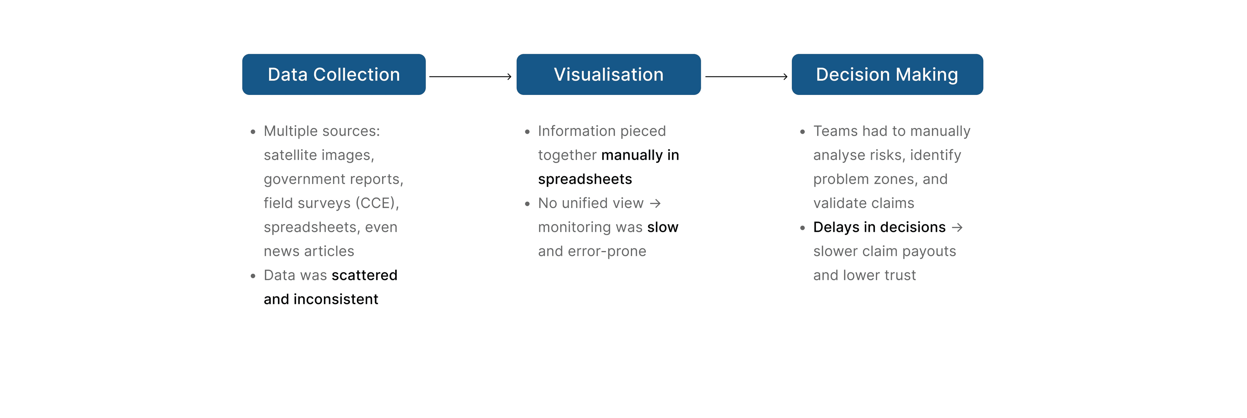 Fragmented workflows caused delays, disputes, and reduced trust between farmers, insurers, and government.
